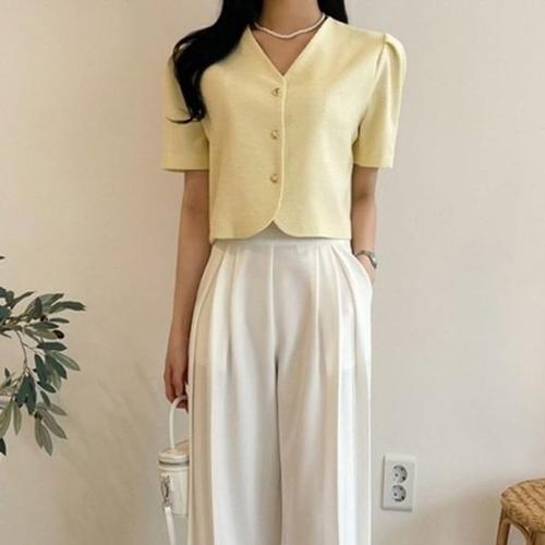 단추 크롭 여성 여름 브이넥 반팔 노카라 자켓 시원한 마이 크롭 재킷