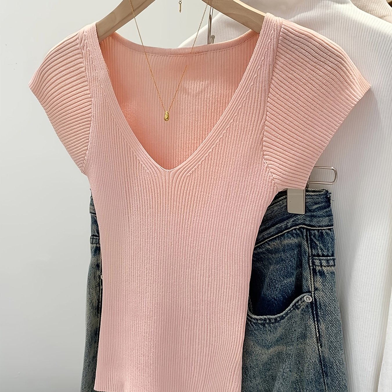TEMU 여름 신상 여성 V넥 리브드 숏탑, 편안한 고탄력 슬림핏 피규어핏 캐주얼 우아한 퀄리티 출근룩 다용도 심플 우아한 아웃핏 발렌타인데이 니앤