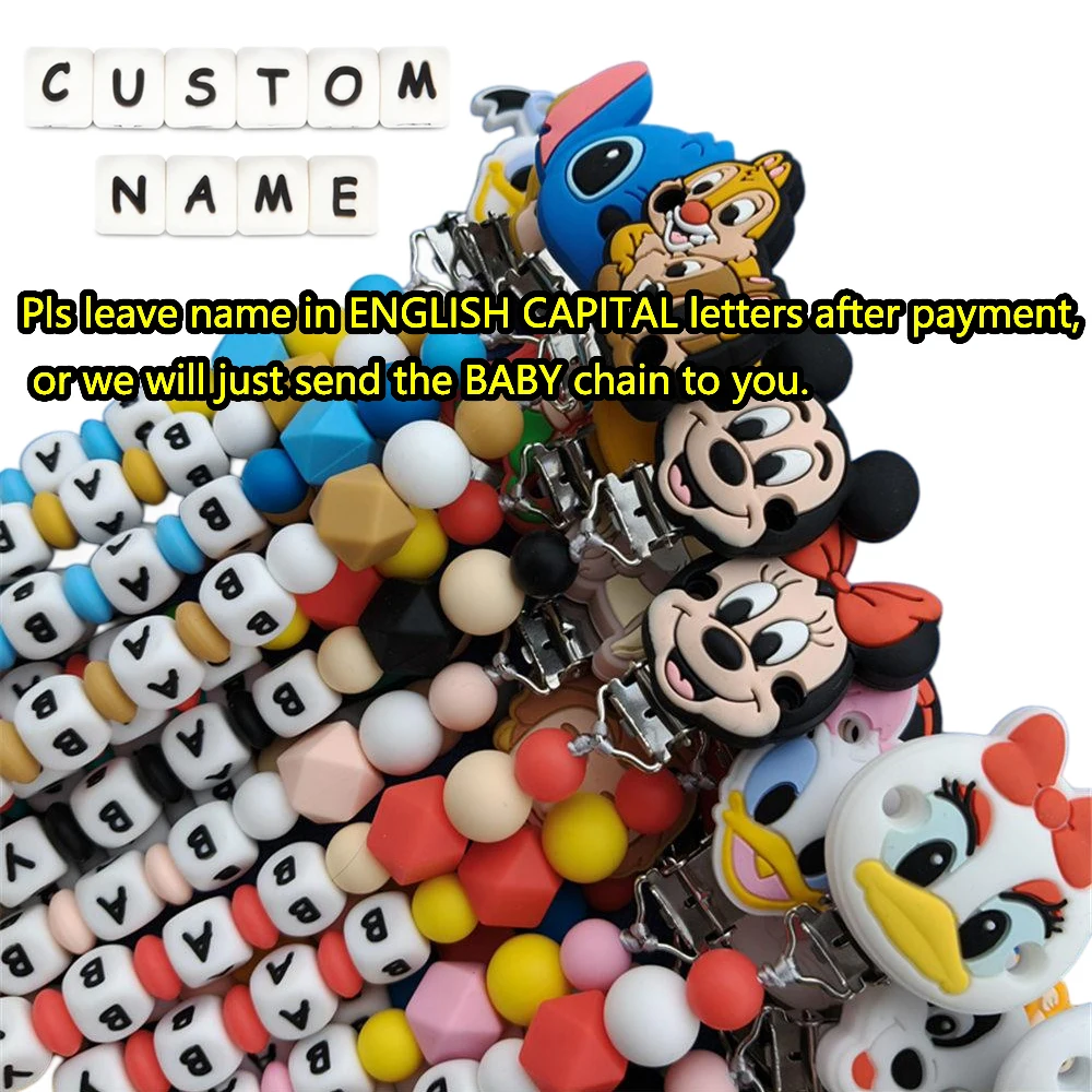1PC 사용자 정의 이름 미키 미니 마우스 덤보 심바 스티치 실리콘 비드 아기 젖꼭지 체인 클립 홀더 젖니 체인 선물