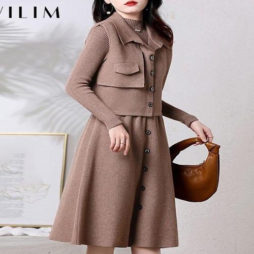 ORZQU 가을겨울 여성 캐주얼 루즈핏 브이넥 민소매 니트 레이어드 조끼 원피스