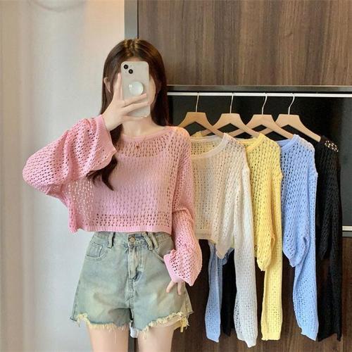 여성용 루즈핏 얇은 니트 긴팔 커버업 탑 한국 스타일 봄 여름 신상 패션 투명한 통풍성 자외선 차단