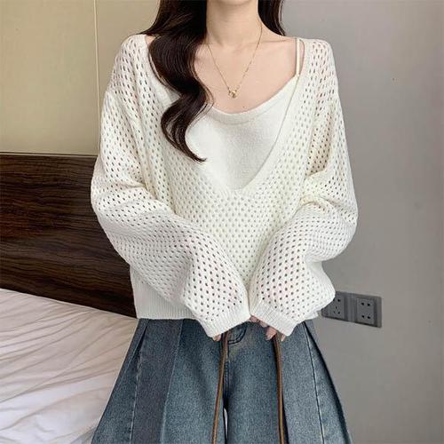 여성 미리준비 가을 니트 가디건 가짜 투피스 패치 긴팔 숏 루즈핏 크롭탑 OOTD3