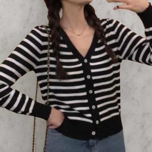 [옷자락] 여성 빈티지 스트라이프 브이넥 롱슬리브 니트 가디건