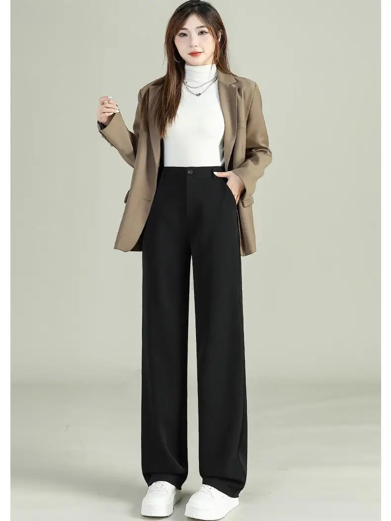 여성 느슨한 봄 여름 2025 새로운 높은 허리 넓은 다리 슬림 캐주얼 바지 한국 패션 트렌드 여성 정장 스트레이트 바지