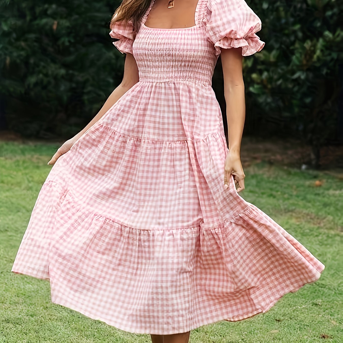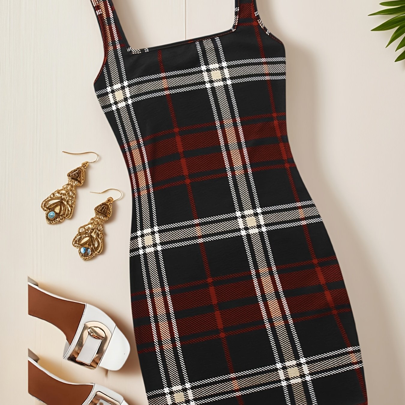TEMU 여성용 스퀘어넥 체크무늬 핏 드레스