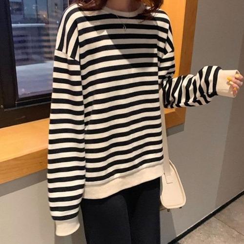 [신상오픈런]여성 캐주얼 두꺼운 스트라이프 기모 라운드넥 맨투맨