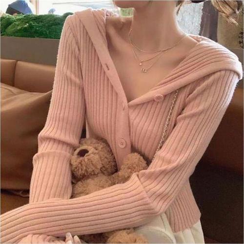 [에이치플러스몰]여자 여리여리핏 골지 긴팔 니트 후드티 단추 가디건 3색