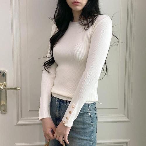 옆단추 여성 니트티 라운드넥 여자 골지 긴팔 티셔츠