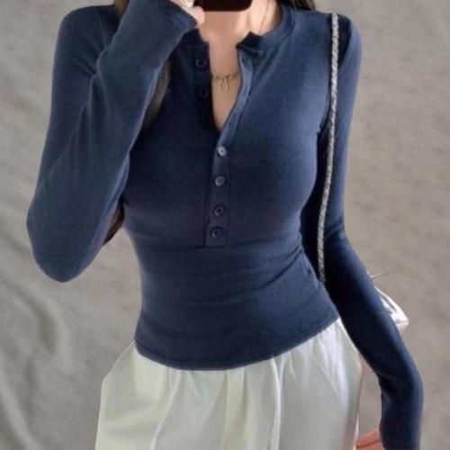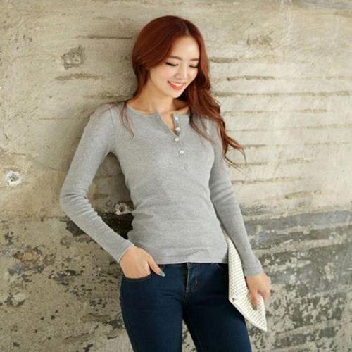 [신상오픈런]여성 헨리넥 버튼 슬림핏 골지 긴팔 티셔츠