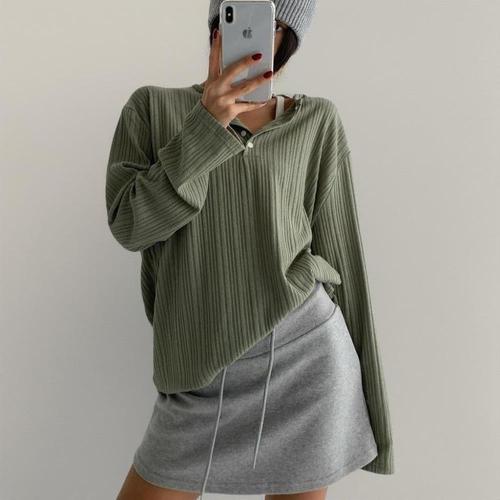 여성용 스레핀 사선 버튼 골지 긴팔 티셔츠 cpt11707k31