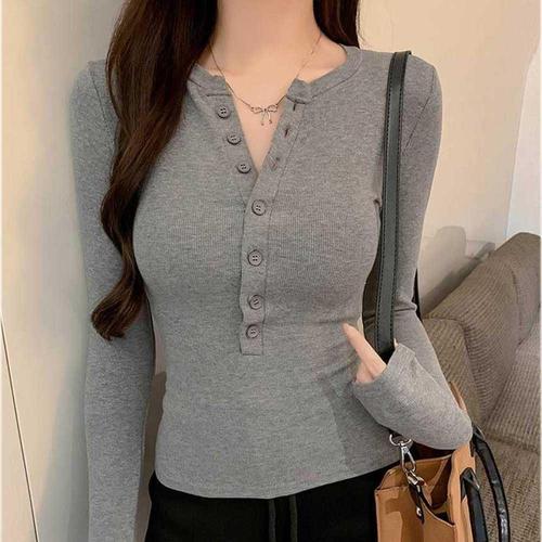 [에이치플러스몰]기본 인기 여성 슬림 단추 감성 골지 긴팔 티셔츠 패