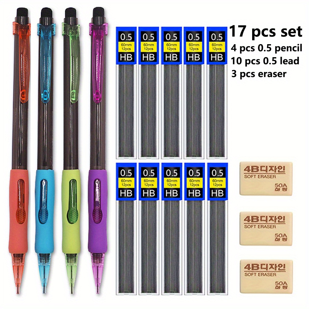 TEMU 17개 세트 0.5mm/0.7mm 자동 연필 스케치 드로잉 필기용 사무용품 학교 용품 | 개학 시즌 | 저렴한 학용품 | 입학 선물 (연필 4개 + 심통 10박스 + 지우개 3개)