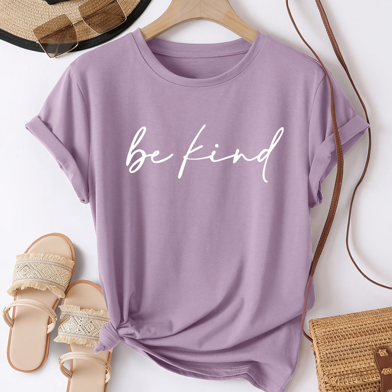 TEMU 여성용 캐주얼 "Be Kind" 라벤더 컬러 커스비즈 레터 프린트 티셔츠 - 소프트 라운드넥 반팔 탑, 레귤러 핏 H라인, 봄/여름 캐주얼 웨어, 디자인, 세탁기 사용 가능 원단