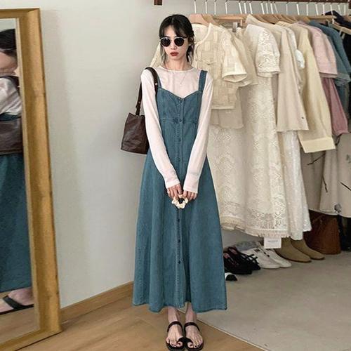 [하프클럽/]데님 하객 여성 원피스 롱니트 멜빵 뮤시란 트