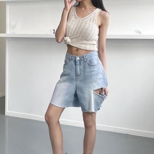 [다잇템]여자 빈티지 데미지진 와이드핏 하프 청반바지 (10500832A)