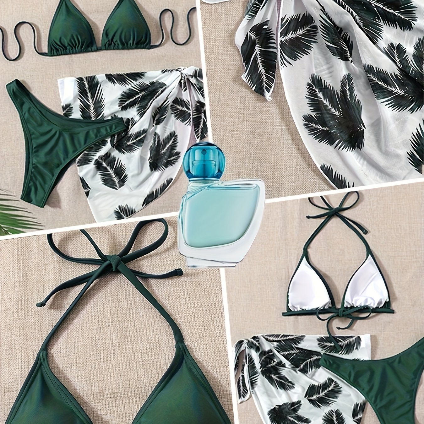 TEMU 여성용 삼각형 묶음 잎사귀 프린트 랩 스커트 비키니 세트