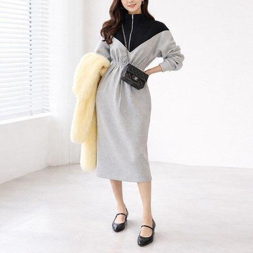 SAHINER 봄가을 여성 헨리넥 슬림 머메이드 니트 롱원피스 데일리룩 LWAQZ35