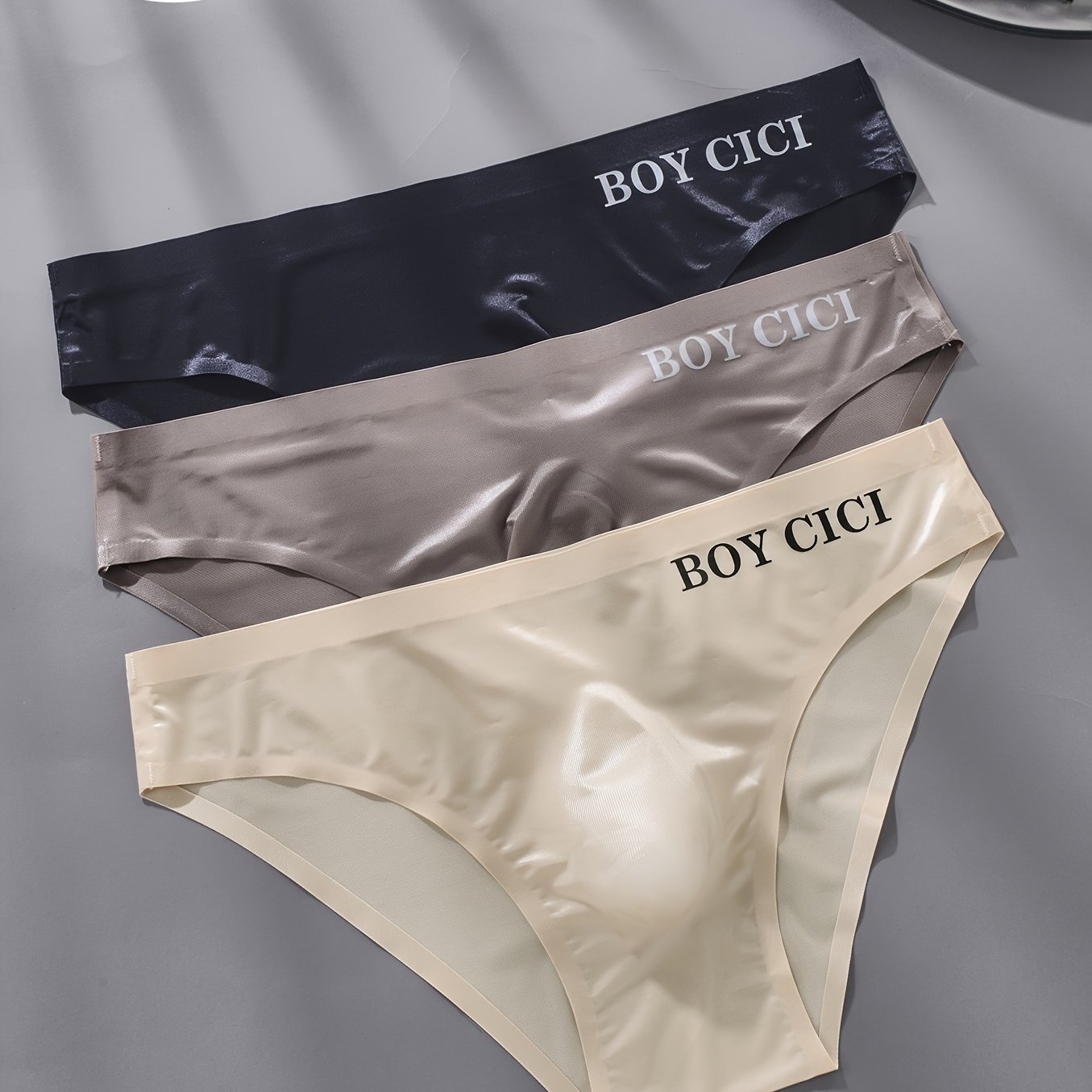 TEMU 남성용 아이스 실키 섬유 로우라이즈 통기성 속옷 3팩 - 보이 시치 글자 반투명 삼각형 팬티, 블랙/네이비/베이지, 체육관 및 캐주얼 착용, 무봉제, 스타일리시한 글자 디자인, 편안한 핏