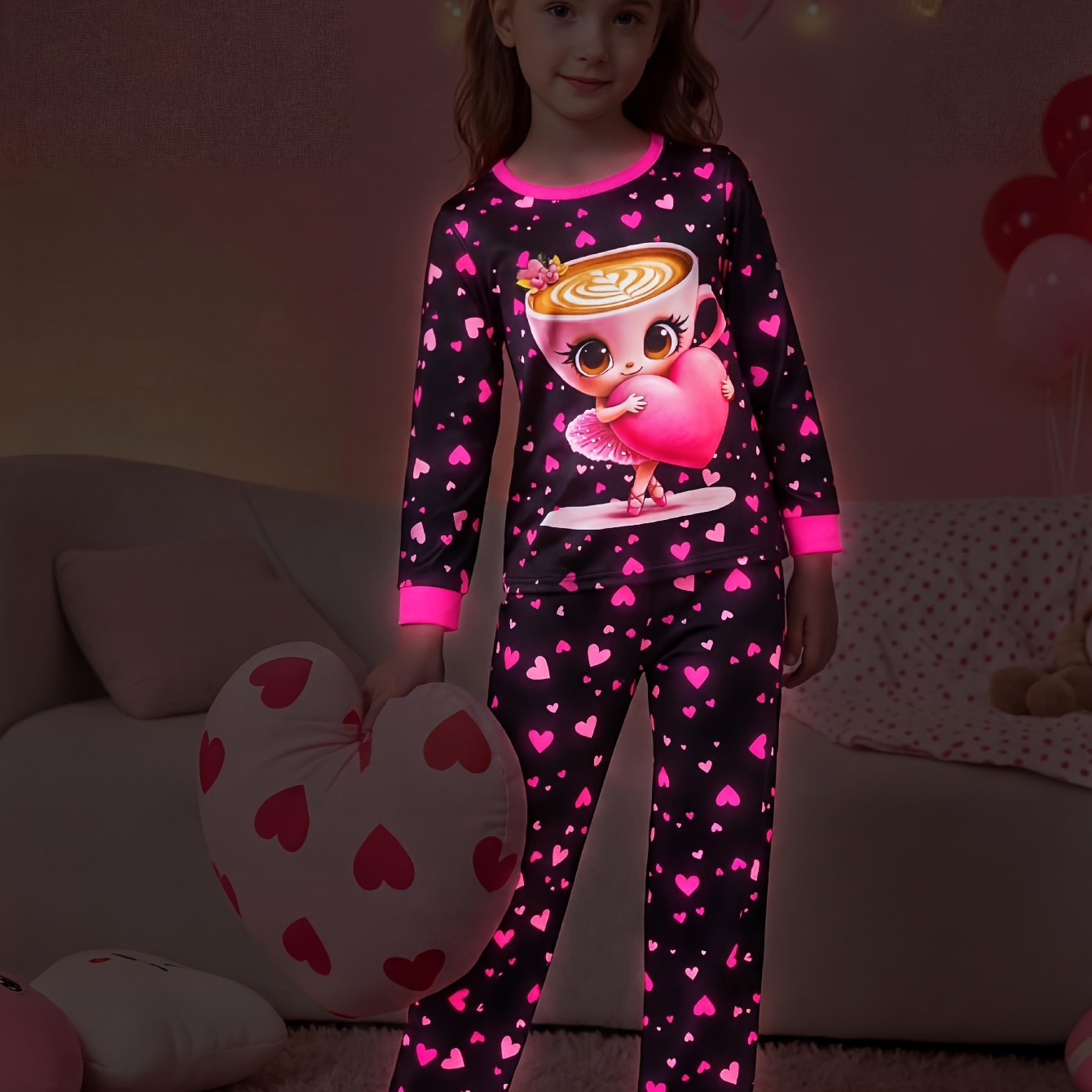 TEMU 투피스 여아용 카푸치노 핸드헬드 하트 프린트 긴팔 상의 + 팬츠 파자마 세트, 야광 효과, 하트 프린트 팬츠, 패셔너블 캐주얼 스타일, 여아용 홈웨어에 이상적