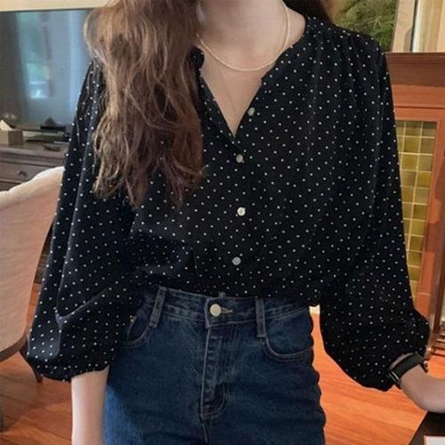 [엄지척]도트패턴 퍼프 소매 쉬폰 도트패턴 블라우스 여친룩_19651637_667501