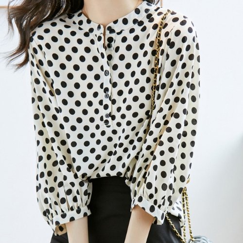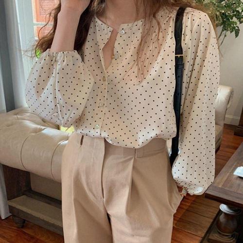 [셀럽하우스]도트패턴 OCLE2916 퍼프 소매 쉬폰 도트패턴 블라우스 여친룩