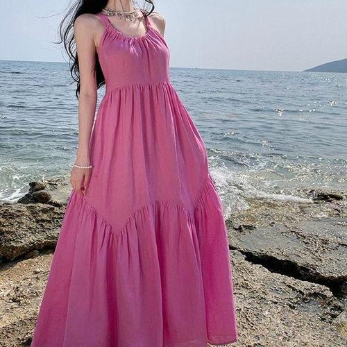[르뚜앙]공햄 여름 나시 휴양지원피스 핑크 민소매 슬리브리스 하객 동남아 휴가 바캉스룩 홀터넥 린넨 ..