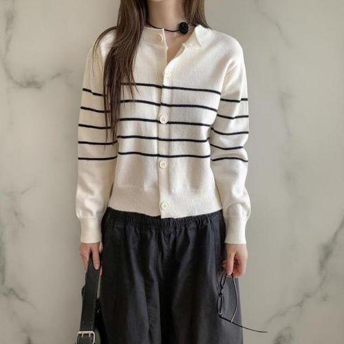 [옷자락] 여성 심플 하프 스트라이프 두꺼운 라운드넥 니트 카디건