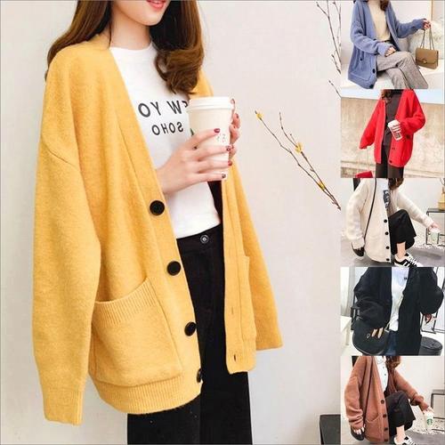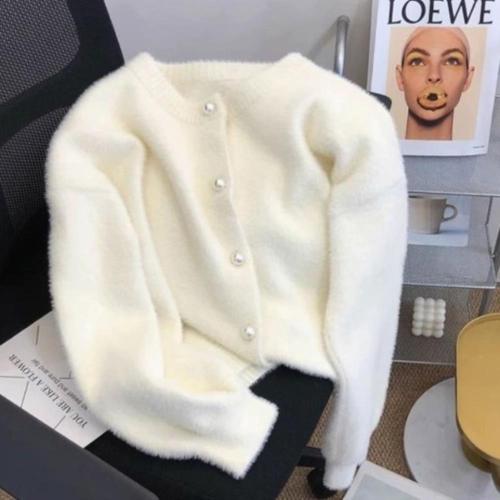 [미라클세븐]여성 루즈핏 두꺼운 퍼 진주 단추 라운드넥 니트 가디건