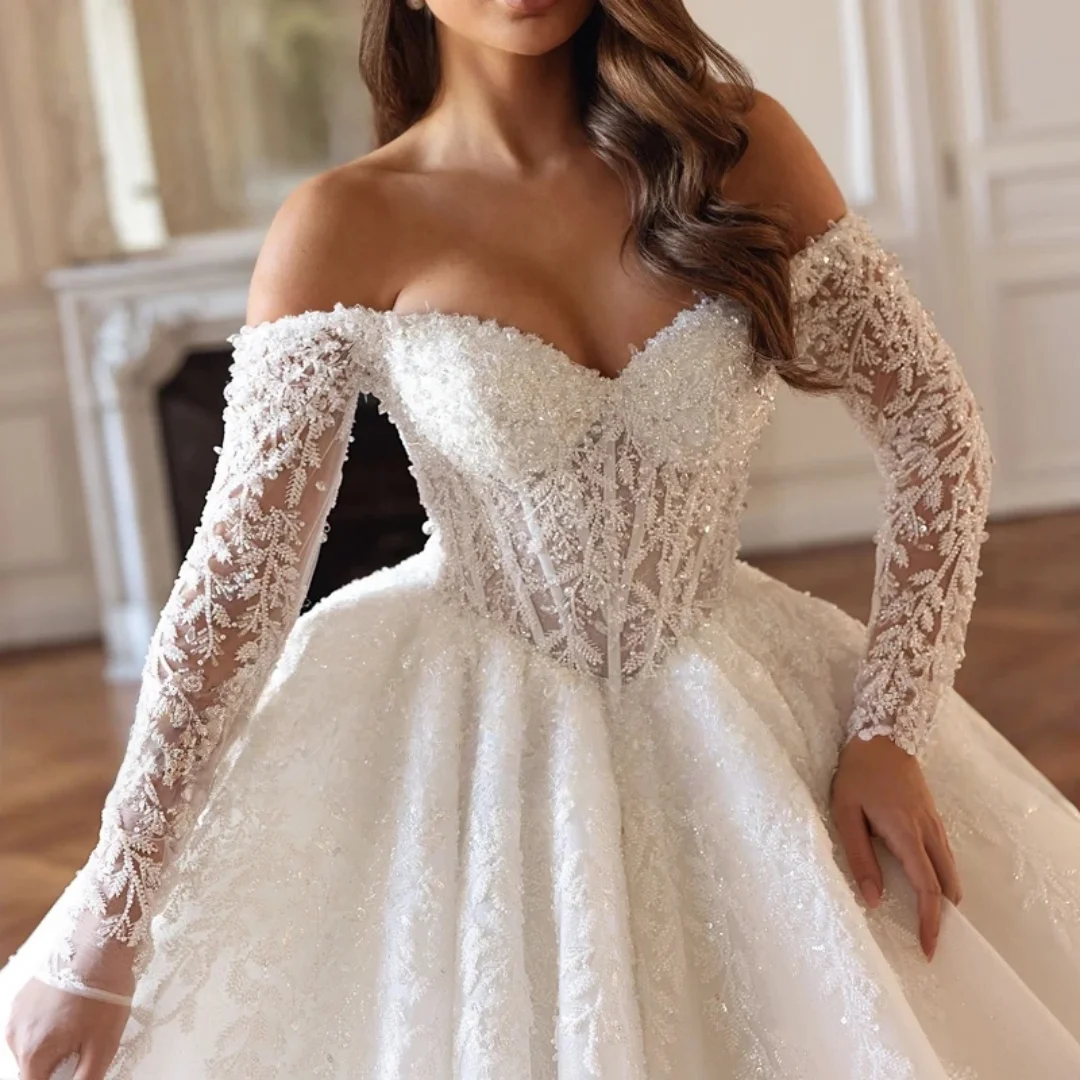 사용자 정의 연인 레이스 업 볼 가운 웨딩 드레스 Exquaisite Appliques 긴 소매 공주 신부 가운 Vestido De Novia
