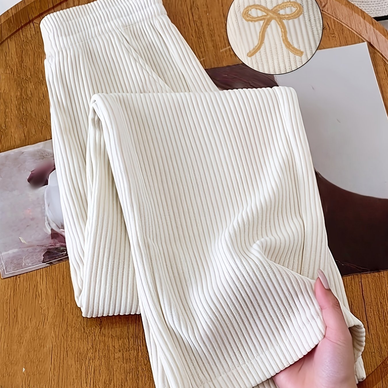TEMU 여성용 코듀로이 조거 팬츠 (포켓 및 자수 리본 장식) | 캐주얼, 자수 디테일, 레그, 편안한 롱 팬츠 (봄/가을)
