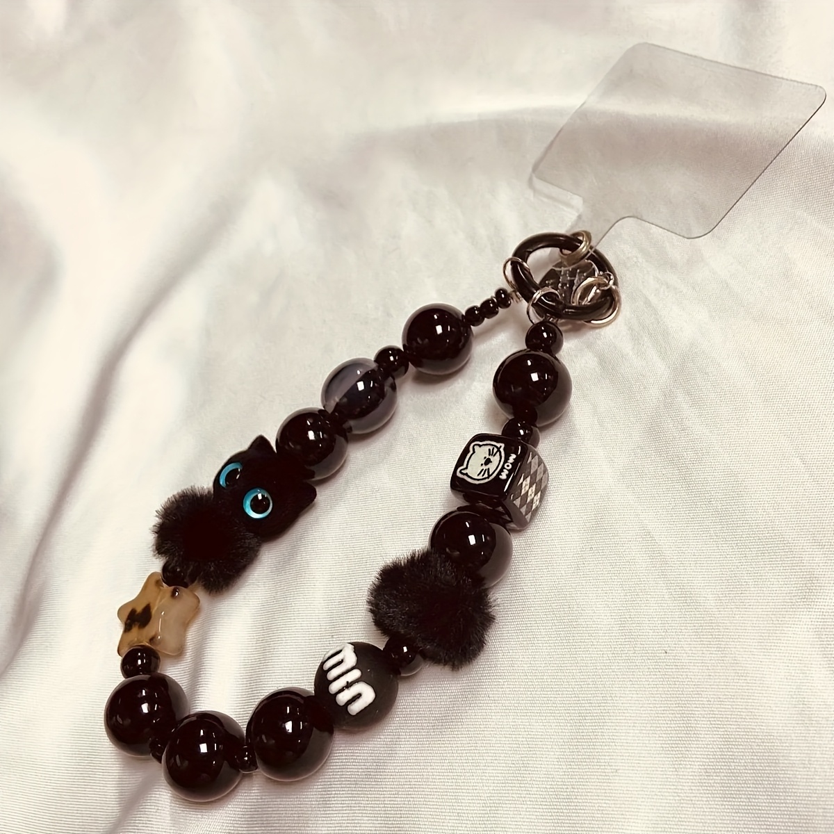 TEMU 여성용 고급 블랙 플러시 고양이 휴대폰 고리 - 귀여운 고양이 디자인의 휴대용 비즈 키체인 & 가방 액세서리, 내구성이 뛰어난 아크릴 소재, 열쇠, 가방 및 일상 사용에 적합, 고양이 액세서리