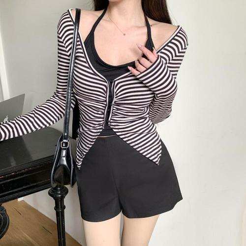 [신상오픈런]여성 슬림핏 스트라이프 딥브이 홀터넥 레이어드 니트 가디건