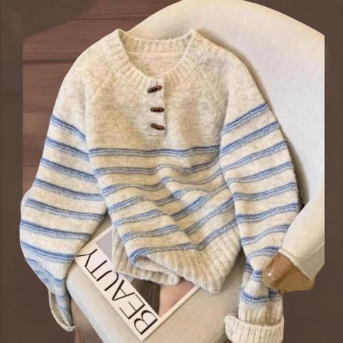 |CCT9FD8|여성 라운드넥 스트라이프 루즈핏 니트 떡볶이 버튼