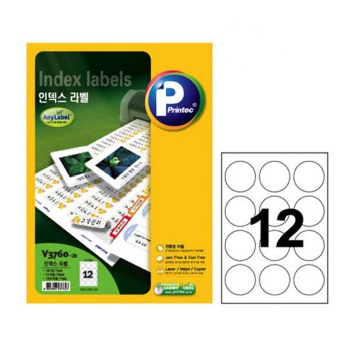 오피스넥스 라벨지 파일 인덱스용 V3760 12칸 원형 20매 프린텍