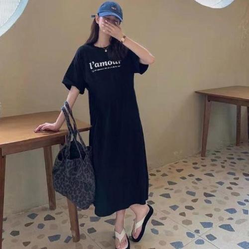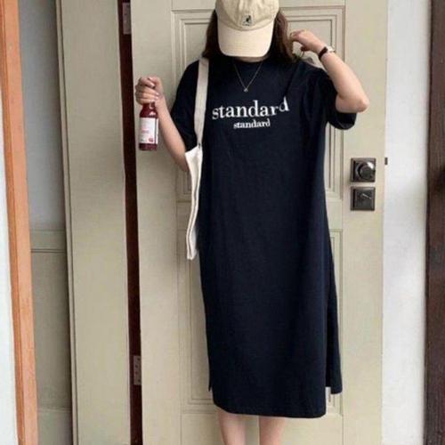 [옷자락] 여성 라운드넥 영문 레터링 트임 반팔 롱원피스