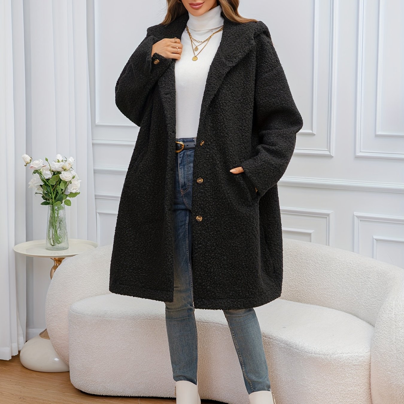 TEMU 여성용 플러스 사이즈 캐주얼 플리스 재킷, 폴리에스테르 95%, 스판덱스 5% 블렌드, 단색, 라펠 칼라, 약간의 스트레치, 직조 직물, 포켓이 있는 가을/겨울용 긴팔 코트