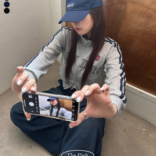 더핑크 / 런탐 트랙 라인 자수 레터링 크롭 집업