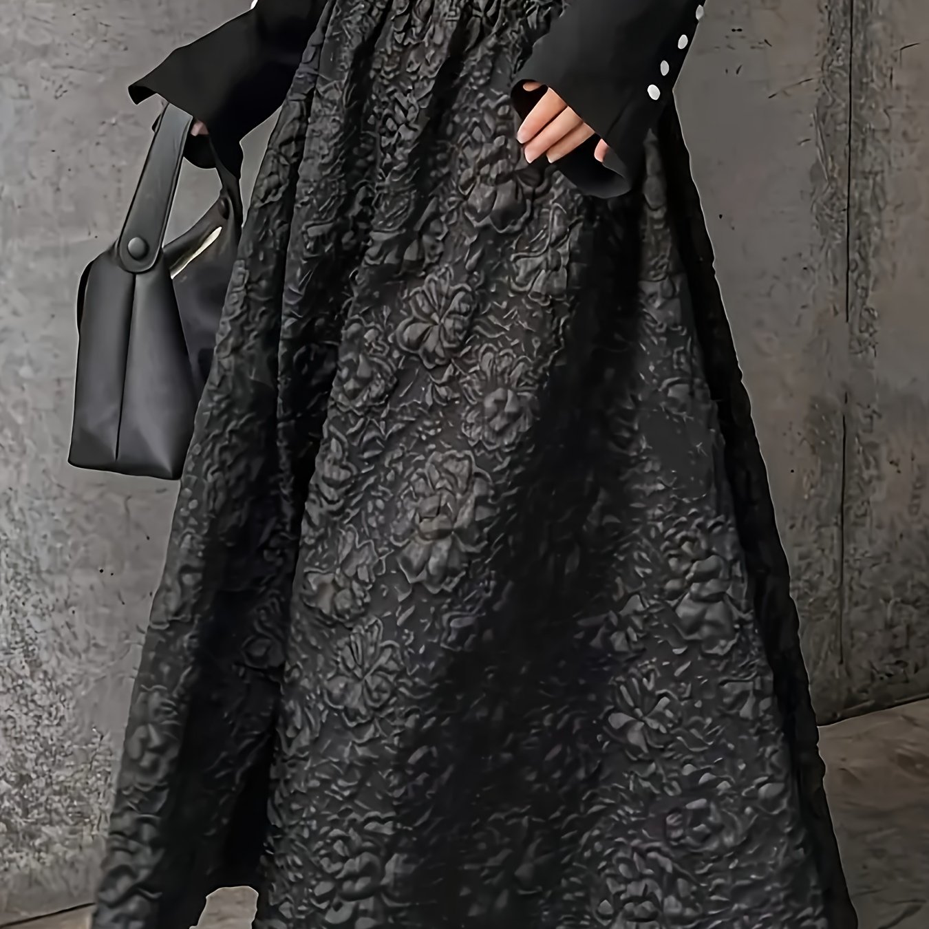 TEMU 여성용 우아한 블랙 플로랄 프린트 미디 스커트 - 하이웨이스트, 흐르는 A라인 실루엣, 캐주얼 또는 정장 행사에 완벽, 사계절 다용도 패션, 캐주얼 의상 | 플로랄 프린트 스커트 | 원단, 여성용 롱 스커트, 맥시 스커트, 겨울 스커트, 여성/여성 스커트, 여름 스커트, 여성 롱 스커트