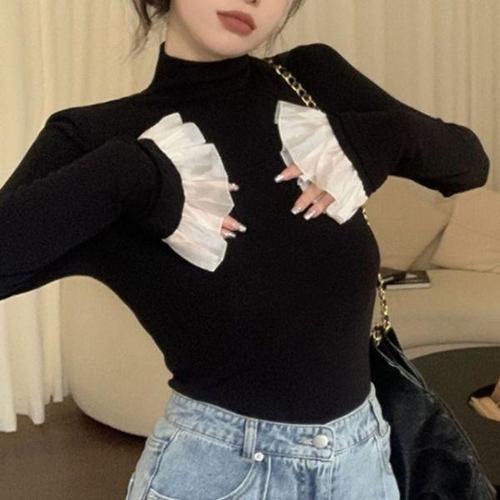 TEMU 여성용 경량 하이넥 레이스 탑, 2024년 봄/가을 신상 러플 엣지 메쉬 베이스 레이어