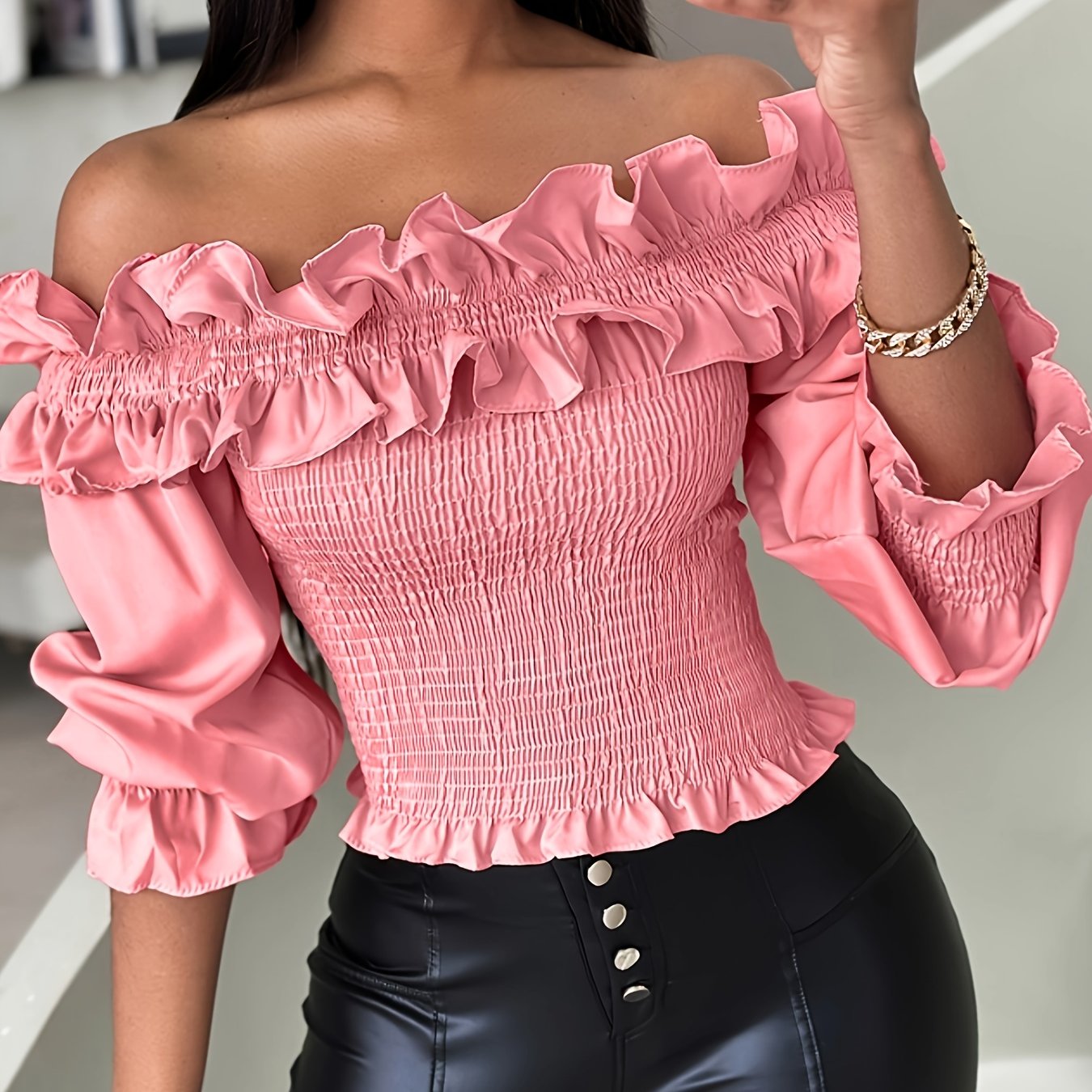 TEMU 여성용 슬림핏 우아한 원숄더/보트넥 셔츠 티셔츠 - 러플 칼라와 긴소매 블라우스, 중간 신축성 사계절용 탑, 세탁기 사용 가능한 솔리드 컬러 아우터웨어