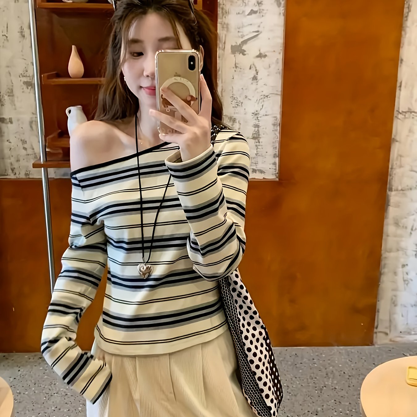 TEMU 여성용 어깨 드러내는 긴팔 탑, 일본과 한국의 스타일로 디자인되어 봄, 가을에 적합한 스위트하고 순수한 한국 스타일의 오프숄더 긴팔 탑입니다.