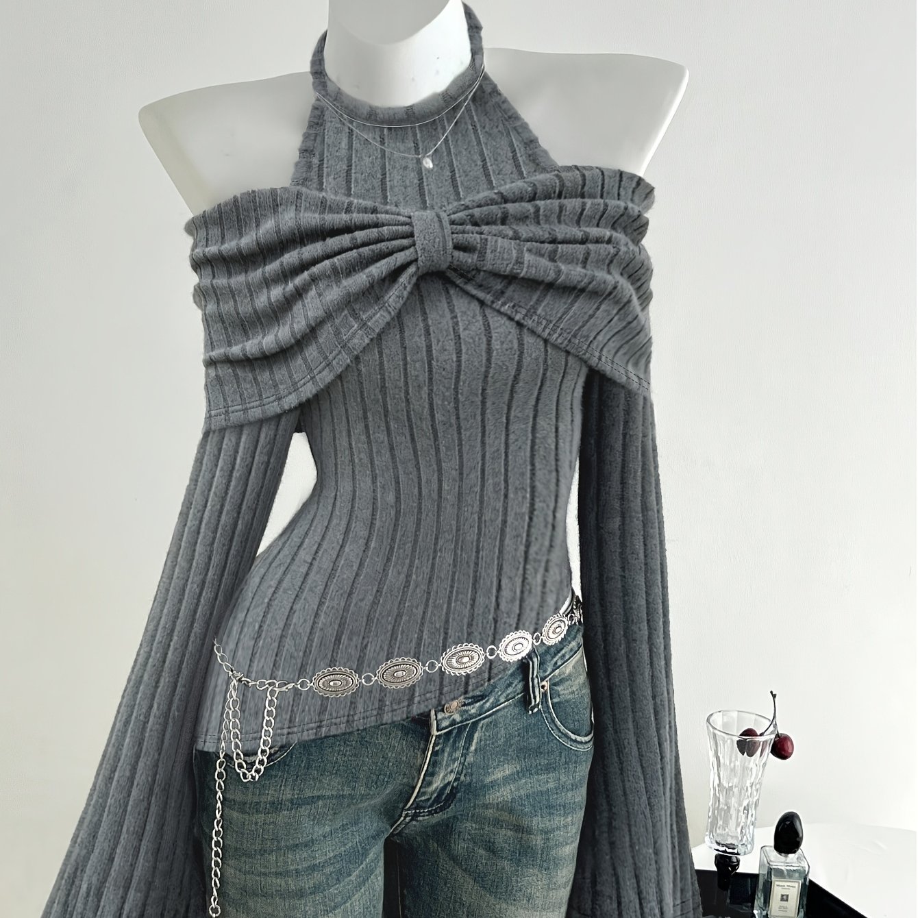 TEMU 캐주얼한 숯빛 그레이 스트레치 탑, 미국 스타일의 빈티지 Y2K 오프숄더 디자인, 불규칙한 플레어 소매, 핏되는 홀터넥이 특징입니다. 이 독특한 아이템은 외출, 통근, 뮤직 페스티벌에 완벽합니다.