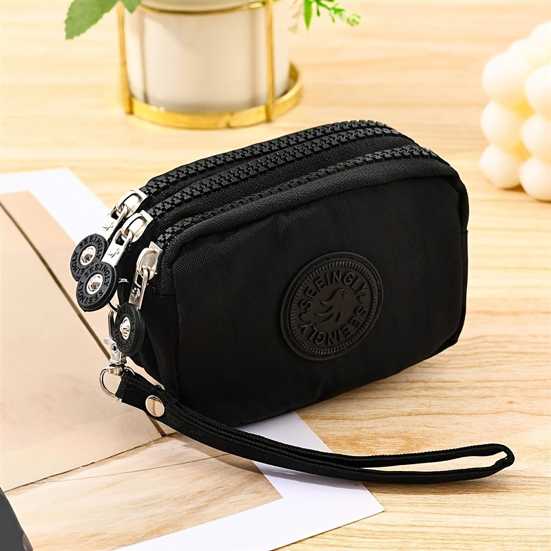 TEMU 빈티지 스타일 3-지퍼 여성 미니 동전 지갑 - 내구성 있는 폴리에스터 컴팩트 클러치, 카드 슬롯, 현금 및 동전 보관, 자수 없음, 색상으로 제공, 귀여운 지갑, 일상 액세서리, 패션 동전 가방, 부드러운 질감