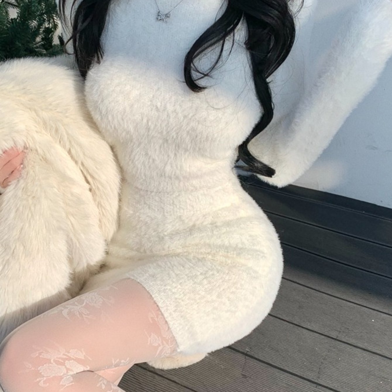 TEMU 가을 겨울 순수한 욕망 스타일 패션 퍼지 라운드넥 긴소매 크롭 스웨터 + 하이웨이스트 힙업 스커트 세트