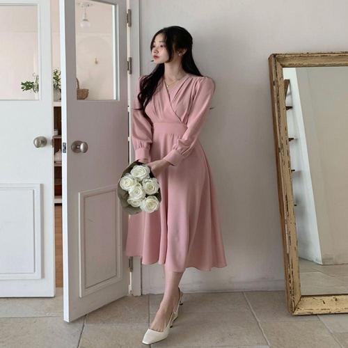 여성 3컬러 봄 가을 랩스타일 러블리 뒷밴딩 롱원피스 WFJG30Y