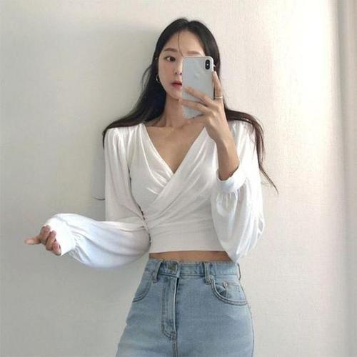 [다잇템_패션]여자 벌룬 잔주름 패드 랩 V넥 롱슬리브 티셔츠