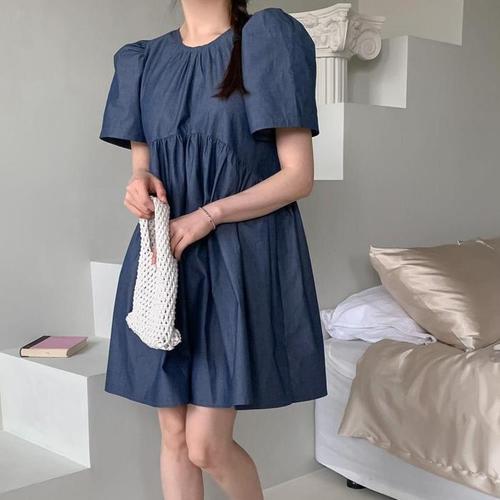 여자 러블리 핀턱 퍼프 미니 라운드카라 미니원피스