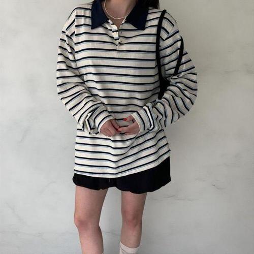 [옷자락] 여성 스트라이프 단추 배색 카라넥 럭비 스타일 긴팔 티셔츠