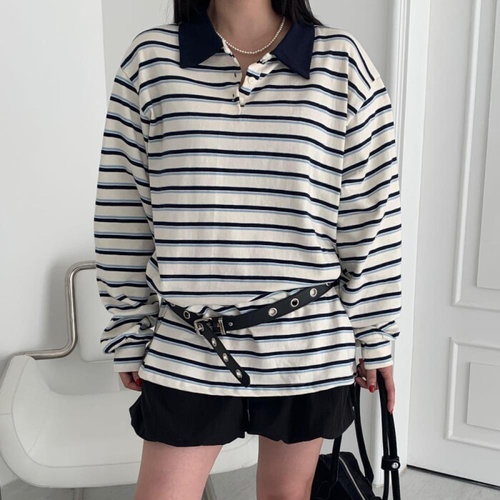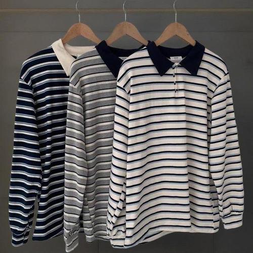 루즈핏 스트라이프 럭비 단가라 카라 긴팔 티 (2col)
