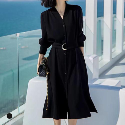 POMTOR 여성 셔츠 원피스 럭셔리 디자인 허리 여밈 가을 롱스커트